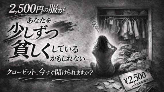 1 2,500円の服が、あなたを少しずつ貧しくしているかもしれない クローゼット、今すぐ開けられますか? タグが付いたままの服。 「安かったから」と買った服。 1回しか着ていない服。 それ、いくら分眠っていますか? 2,500円。 安いですよね。 でも、数回しか着... 2026.02.28 1